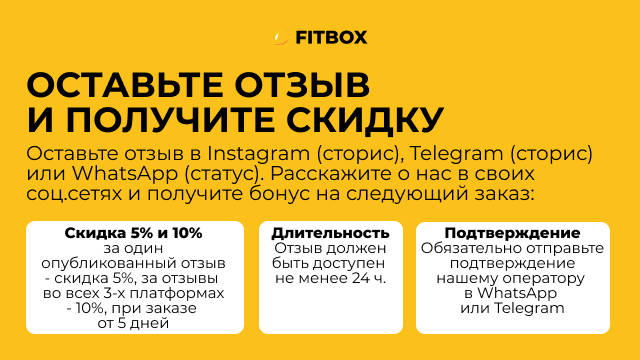 Оставьте отзыв в Instagram (сторис), Telegram (сторис) или WhatsApp (статус). Расскажите о нас в своих социальных сетях и получите бонус на следующий заказ: